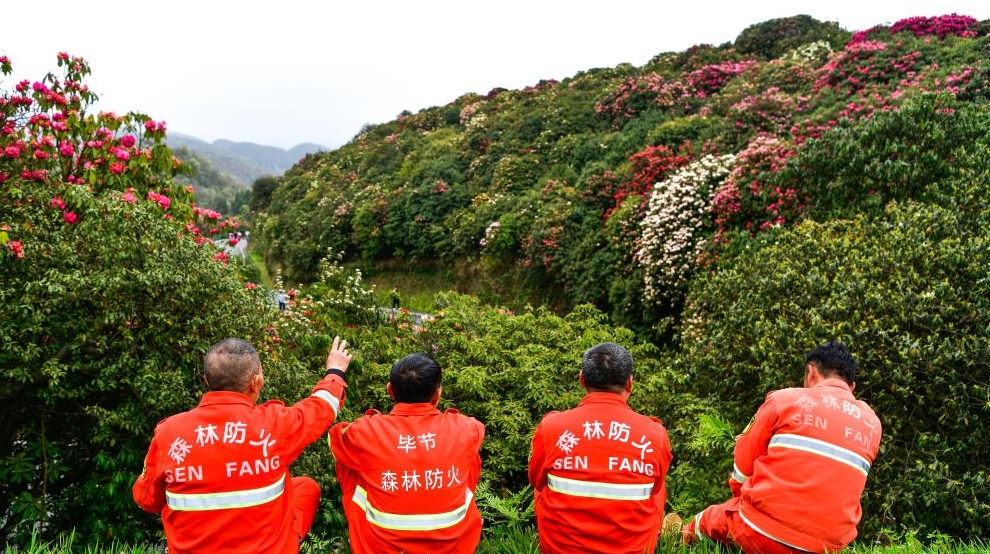 Forest rangers step up fire prevention during azalea bloom in SW Chinas Guizhou乌蒙山连着山外山,